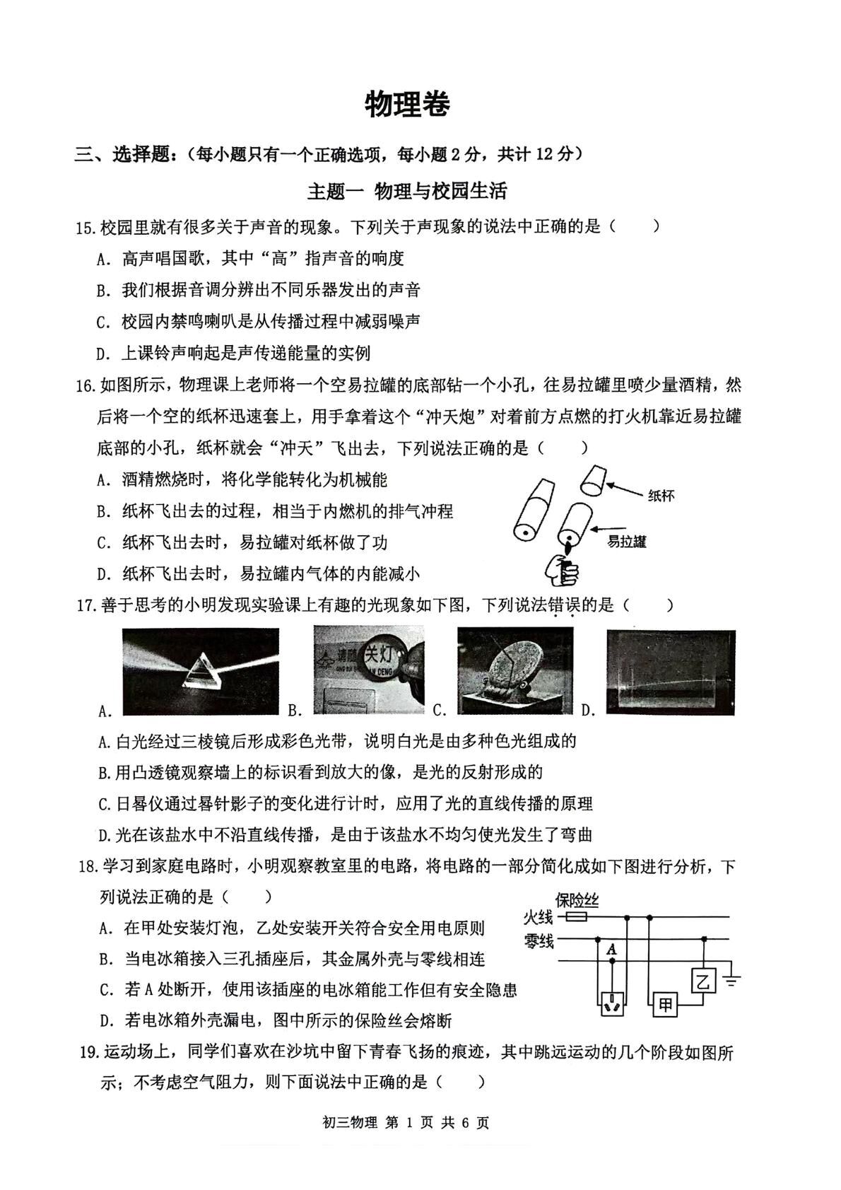 2025年4月深圳市多校初三质量检测物理试卷