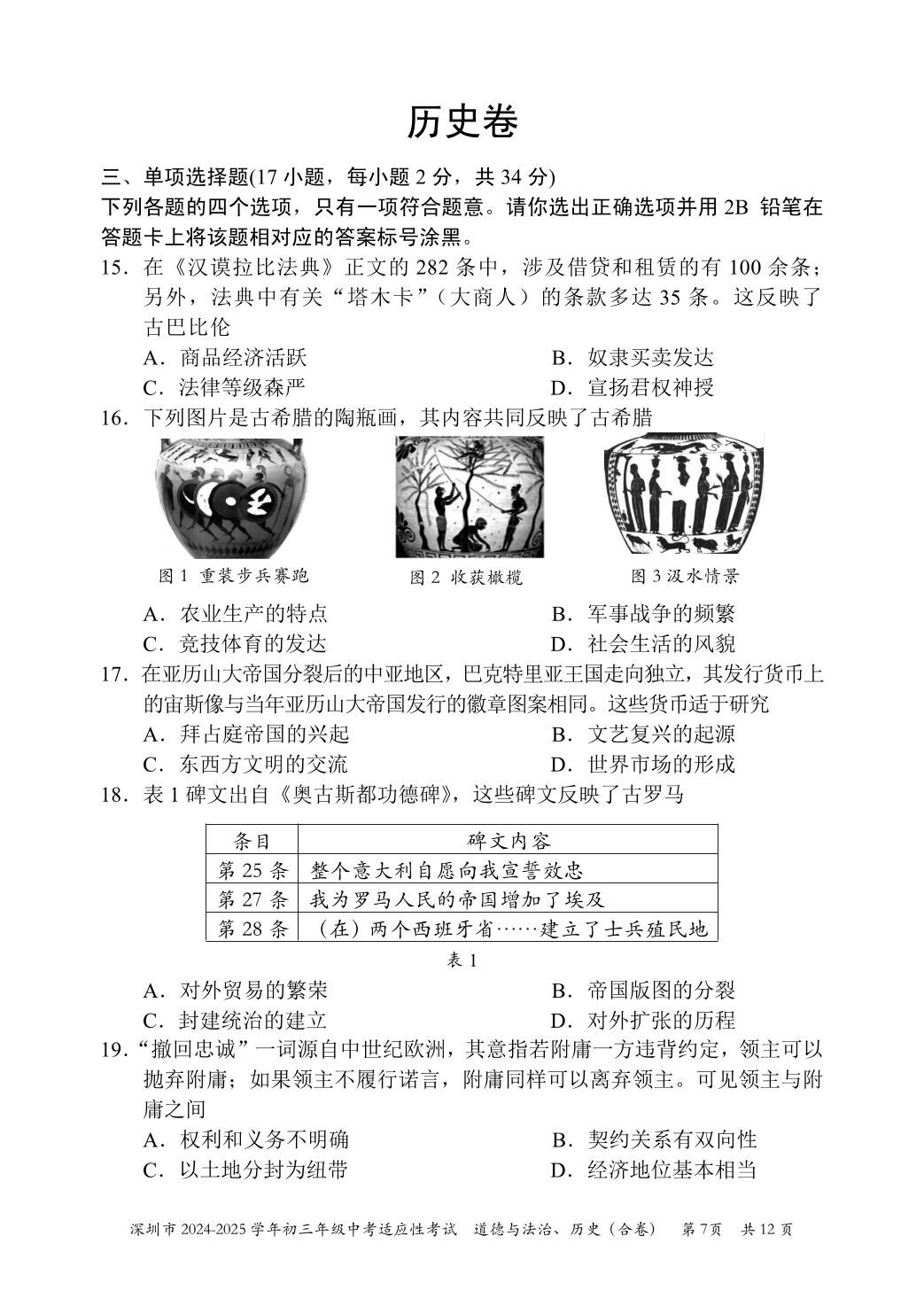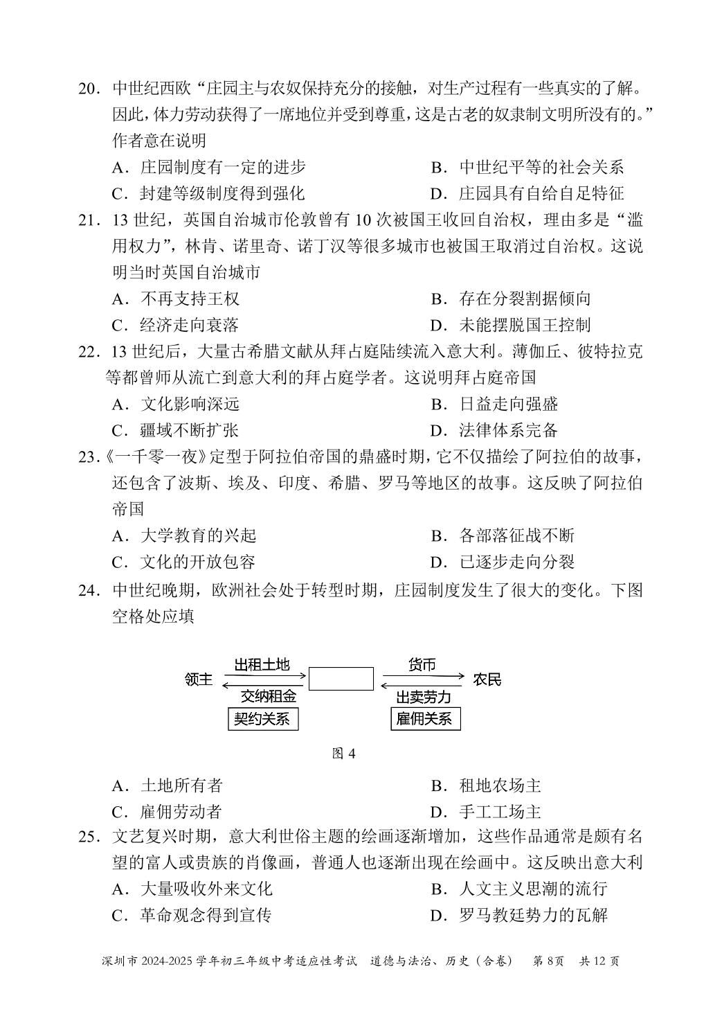 2024-2025学年深圳市初三中考适应性考试历史试卷