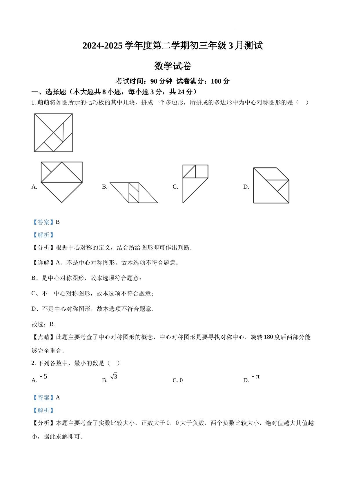 广东省深圳实验学校初中部2024-2025学年下学期九年级3月测试数学试卷(一模)(解析版)
