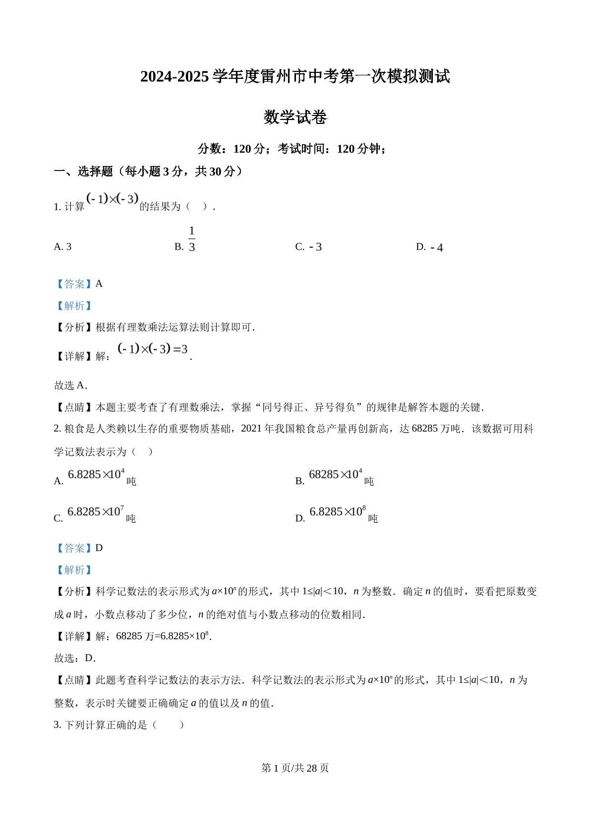 2025年广东省湛江市雷州市中考一模联考数学试题(解析版)