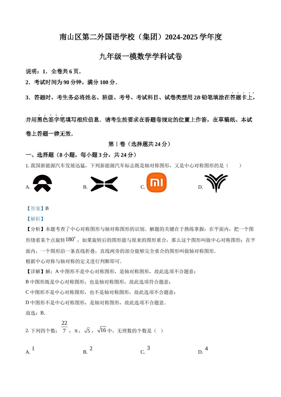 广东省深圳市南山第二外国语(集团)2024-2025学年 九年级中考一模数学试题(解析版)