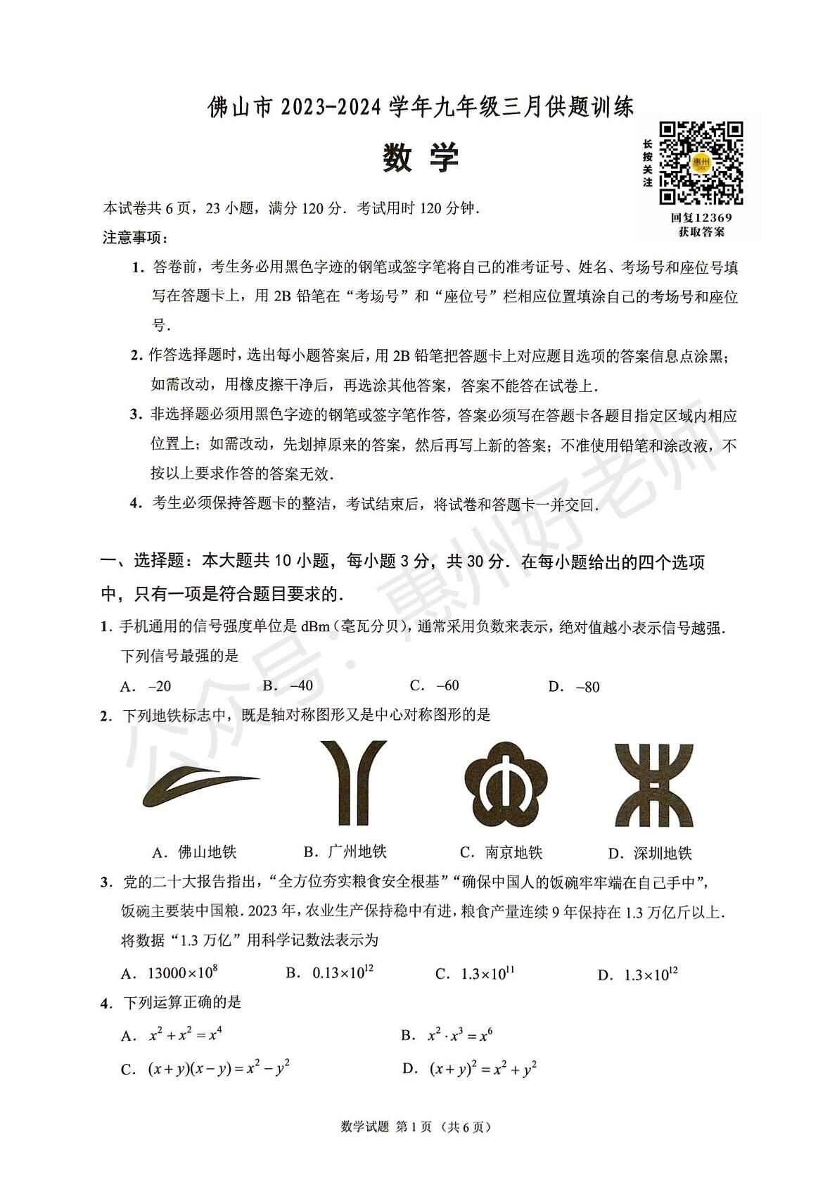广东省佛山市2023-2024学年九年级下学期3月月考数学试题