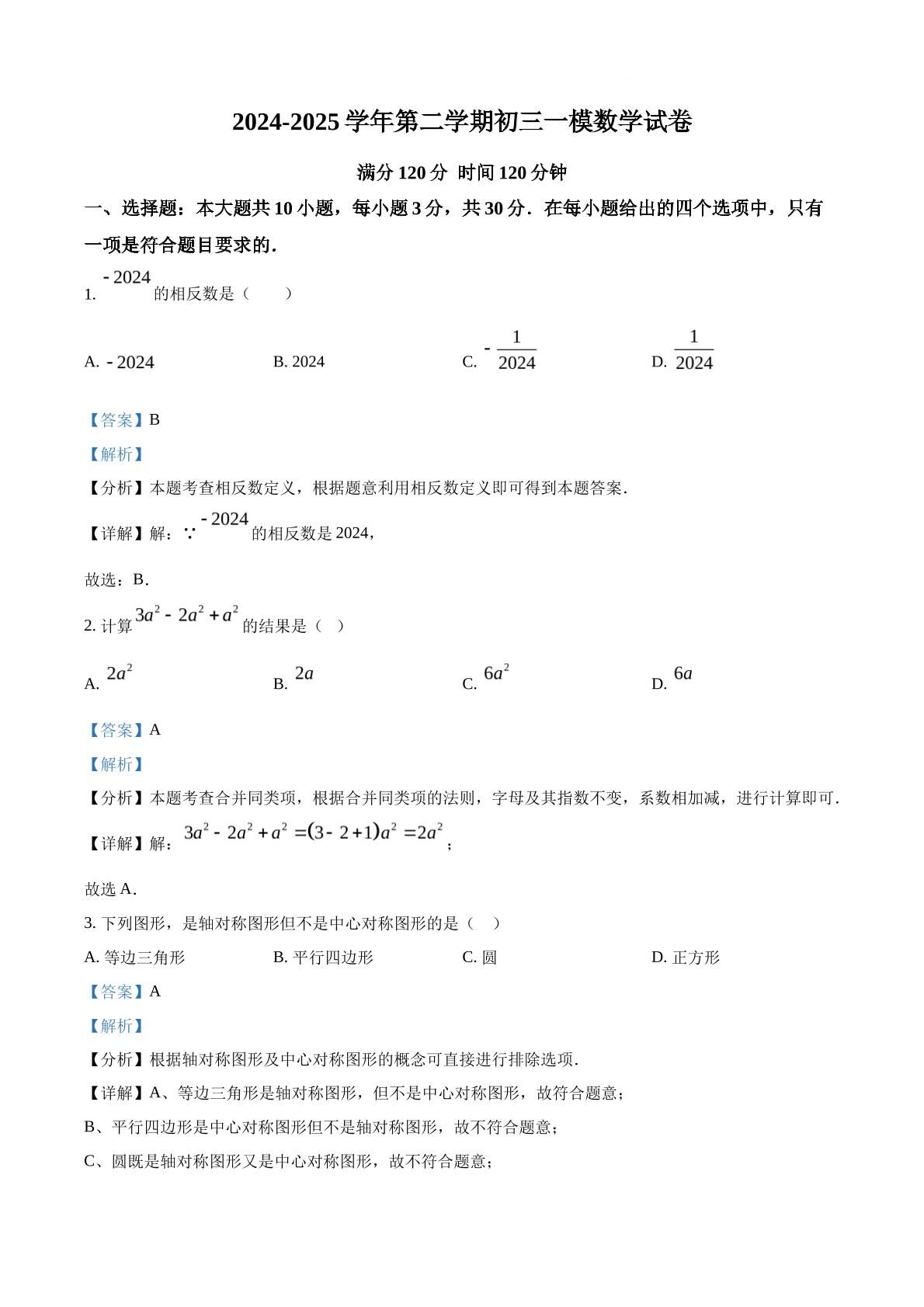 广东省珠海市第九中学2024-2025 学年下学期九年级中考一模数学试卷(解析版)